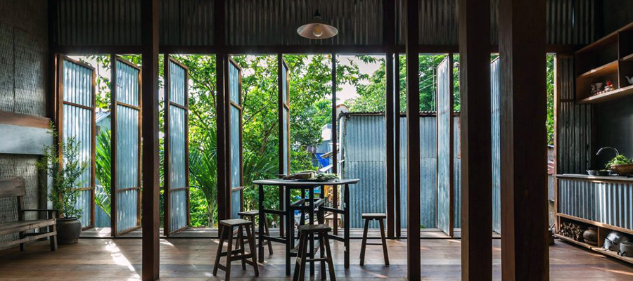 Located in the suburban town of Chau Doc in An Giang province, Southern Vietnam, this house serves as a communal residence for three families. The architects wanted to not only have the house blend well with its environment—both in physical appearance and spirit—but also have it filled with daylight, natural ventilation and open to the surrounding views of nature, as if living in a semi-outdoor space.
