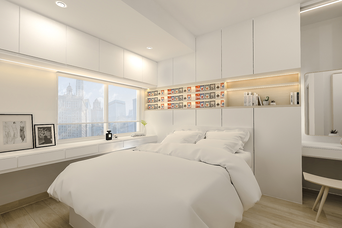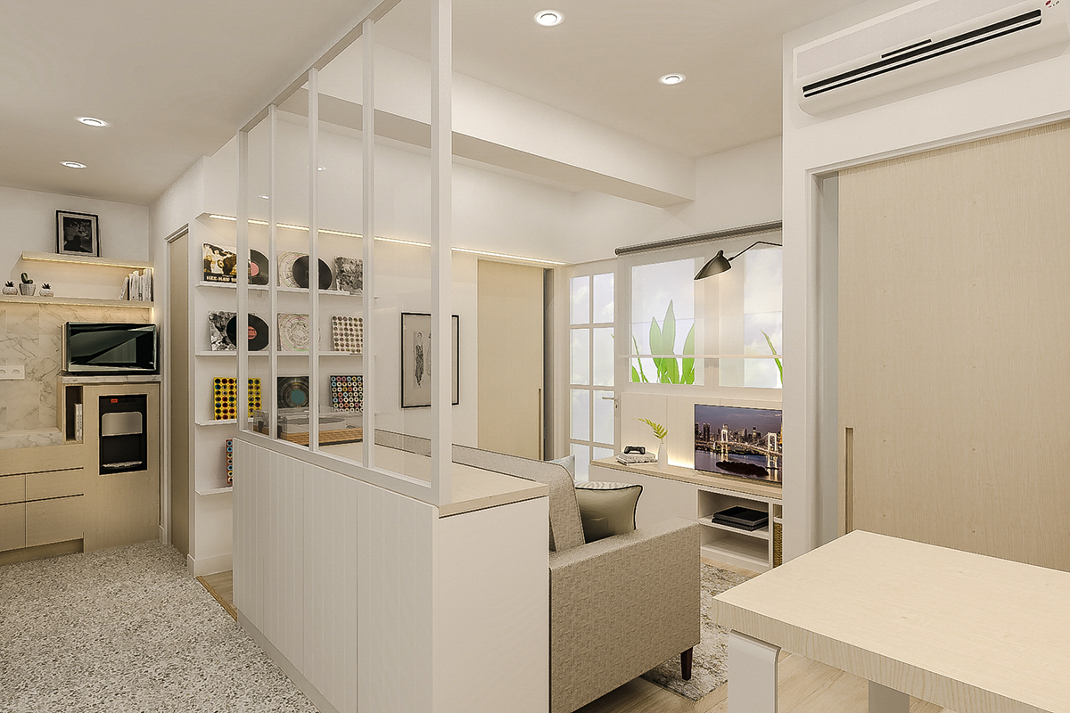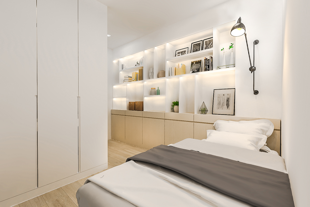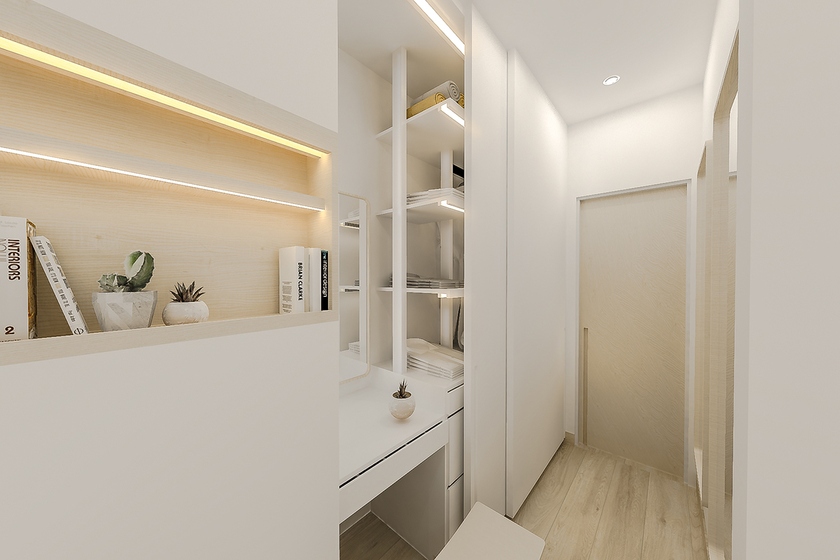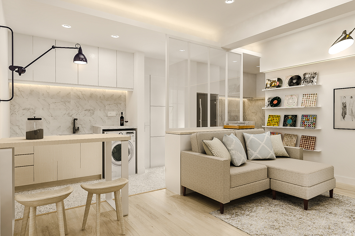 The apartment unit was designed for accommodating owner collections. The owner requested large storage for displaying the collection such as vinyl records, international remi cards, books and fashion works. White and pale wood are the main color scheme inside the whole unit. There are several black thin line as the small accent.